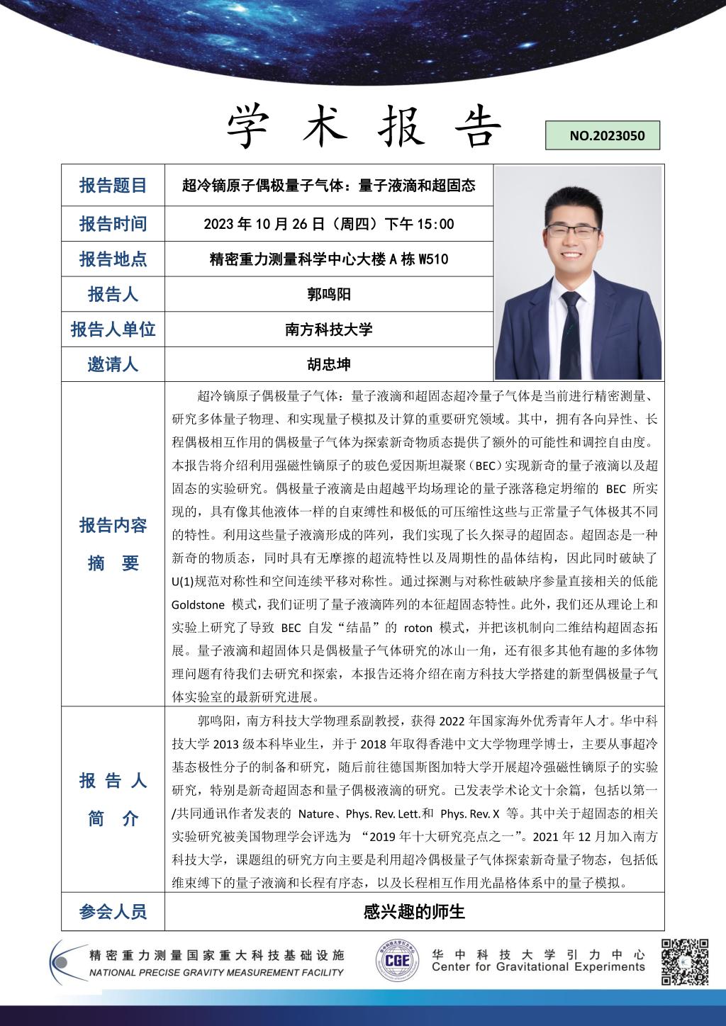 学术报告(20231026)超冷镝原子偶极量子气体:量子液滴和超固态