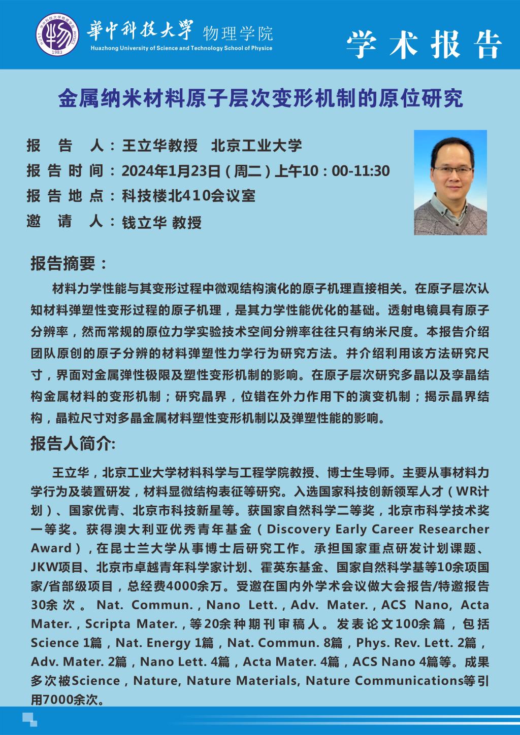 学术报告(20240123)金属纳米材料原子层次变形机制的原位研究