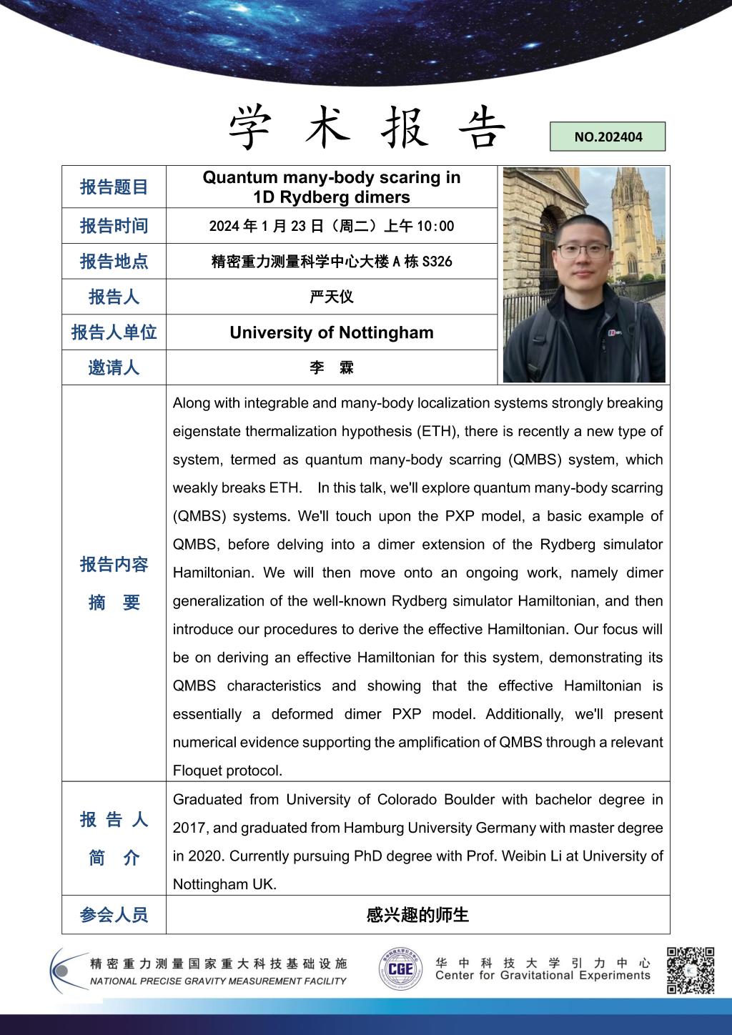 学术报告(20240123)Quantum many-body scaring in 1D Rydberg dimers