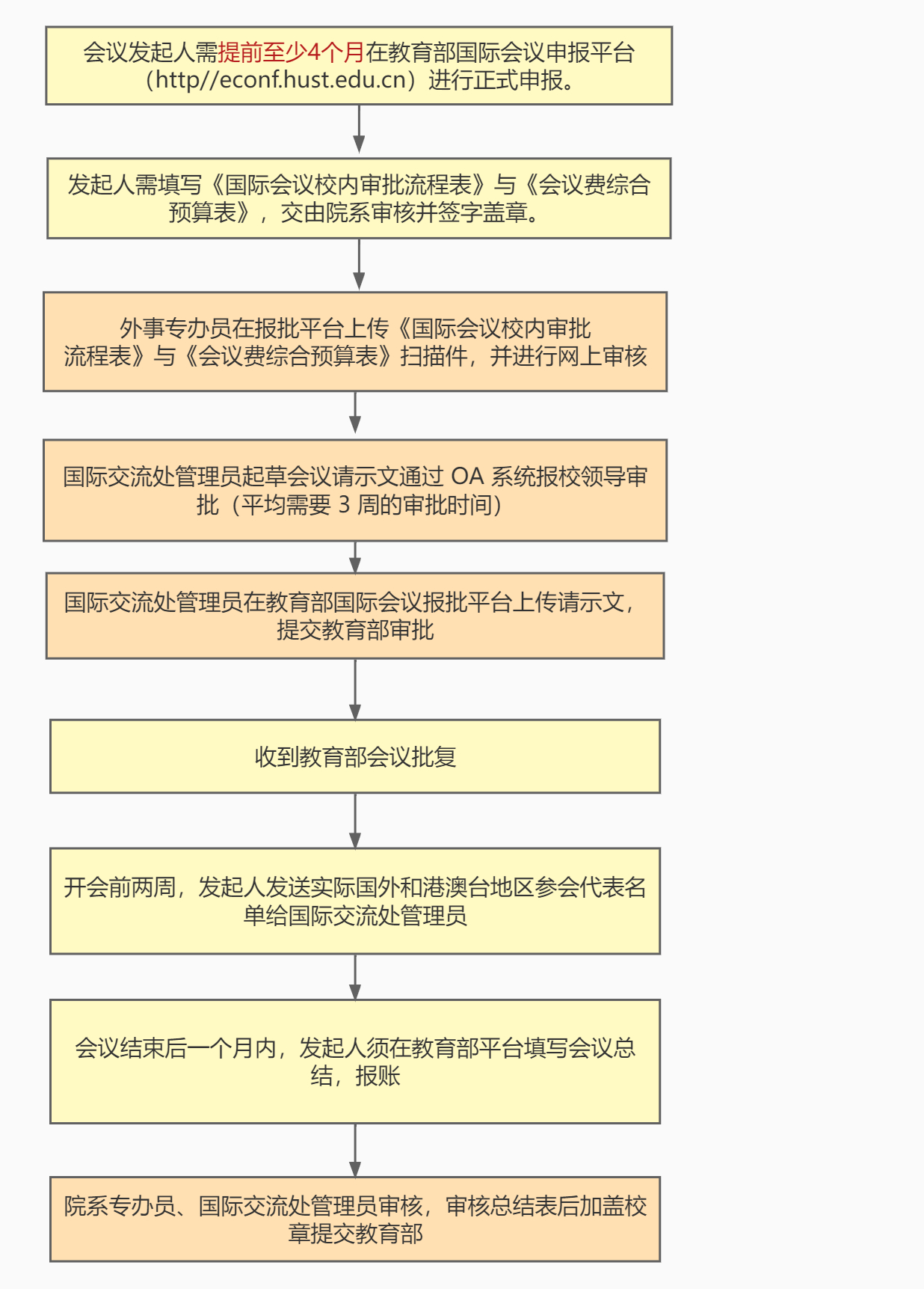 注意事项: (一)会议必须在申报单位所在地举办,不得“异地办会”。 (二)在获得教育部正式会议批复前,任何单位和个人不得对外承诺举办会议、发布正式的会议通知或邀请。 (三)严格控制会期、会议规模和会议规格。不得为提高会议规格,随意使用“峰会”、“高峰论坛”、“首届”等称谓。严禁借办会之名建立常设“秘书处”等机构。 咨询:公司人事与外事科江可凡老师(科技楼北402,027-87543981)