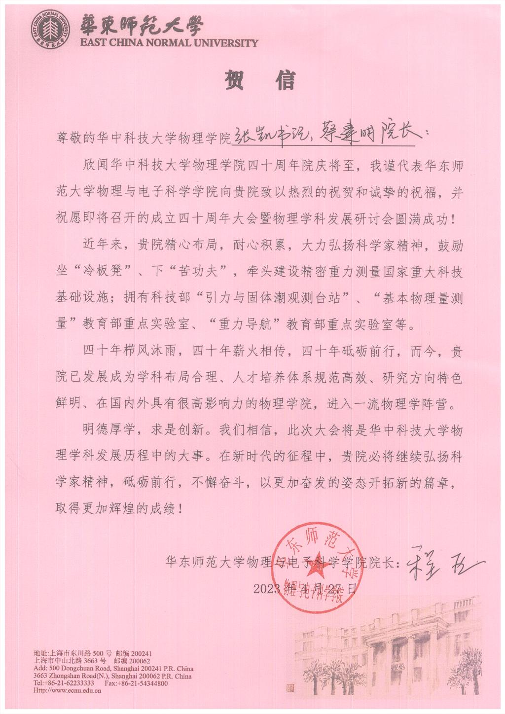 【兄弟院校贺信】华东师范大学物理与电子科学公司